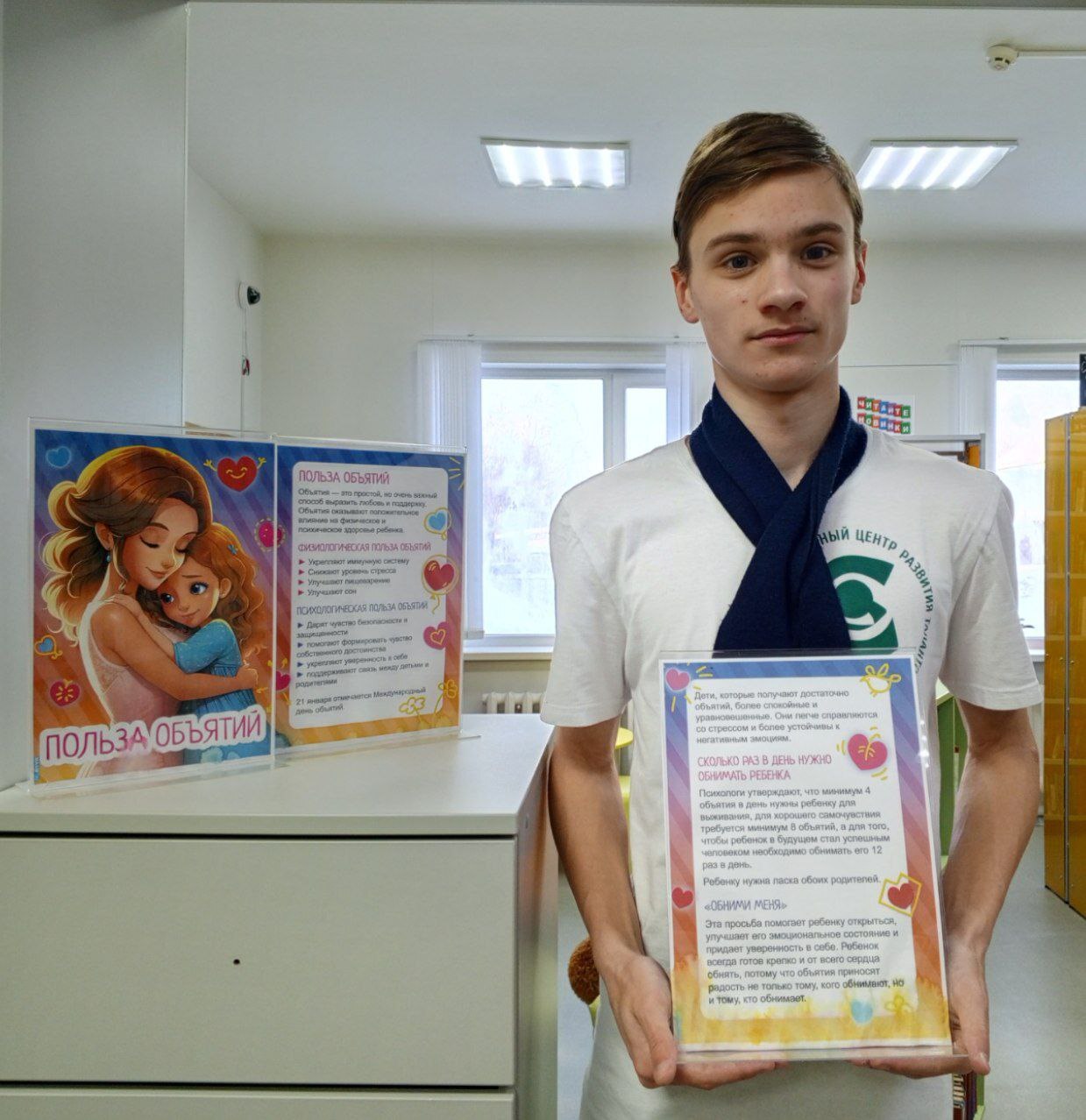 Для наших посетителей мы подготовили информационные минутки «От сердца к сердцу», где рассказали об истории праздника и — что особенно важно — о научно доказанной пользе объятий для человека: